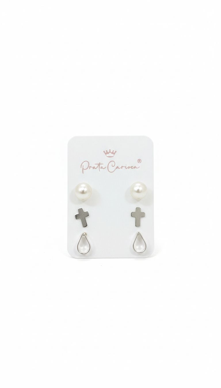 TRIO DE BRINCOS PÉROLA, CRUZ E GOTA SEMI JÓIAS